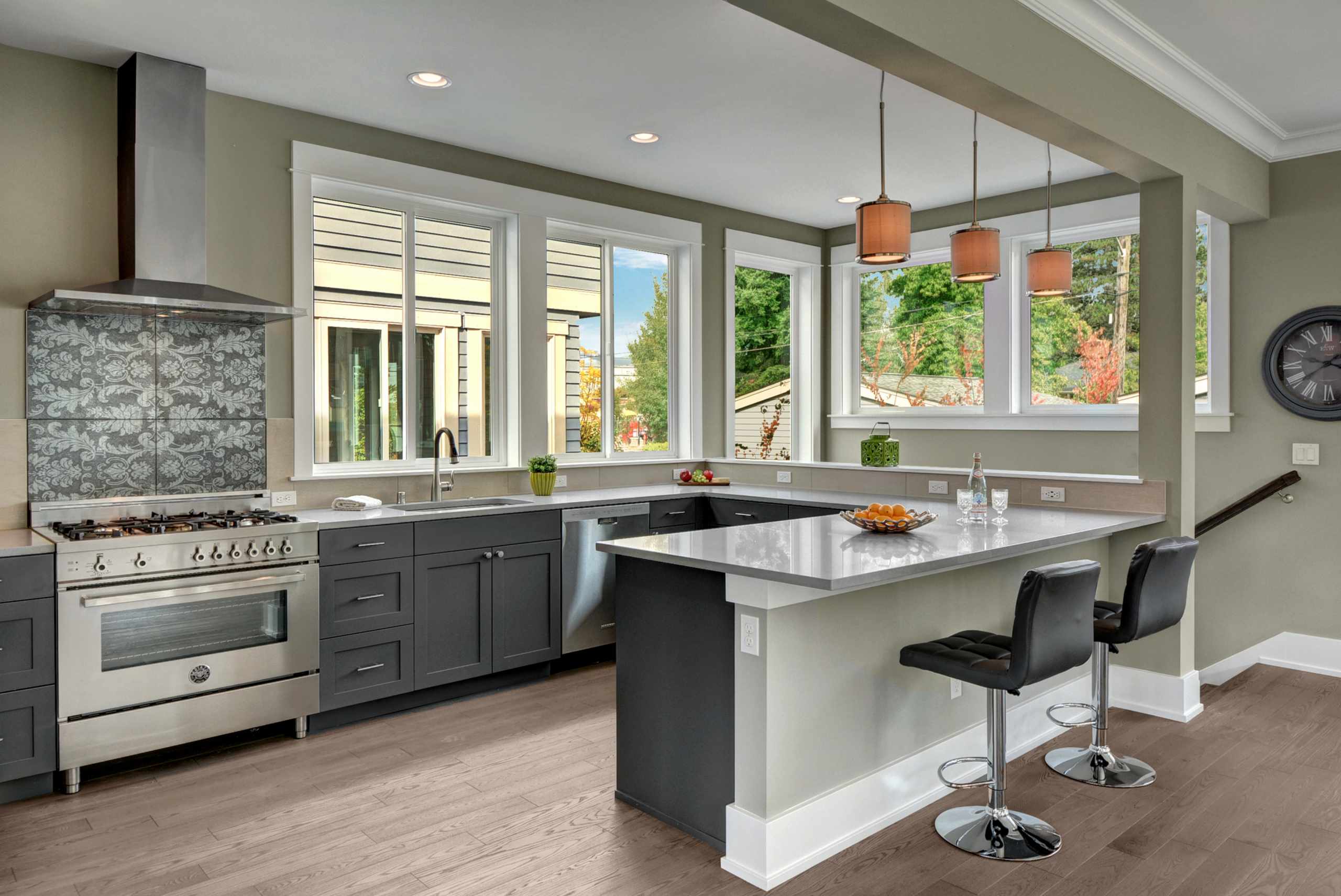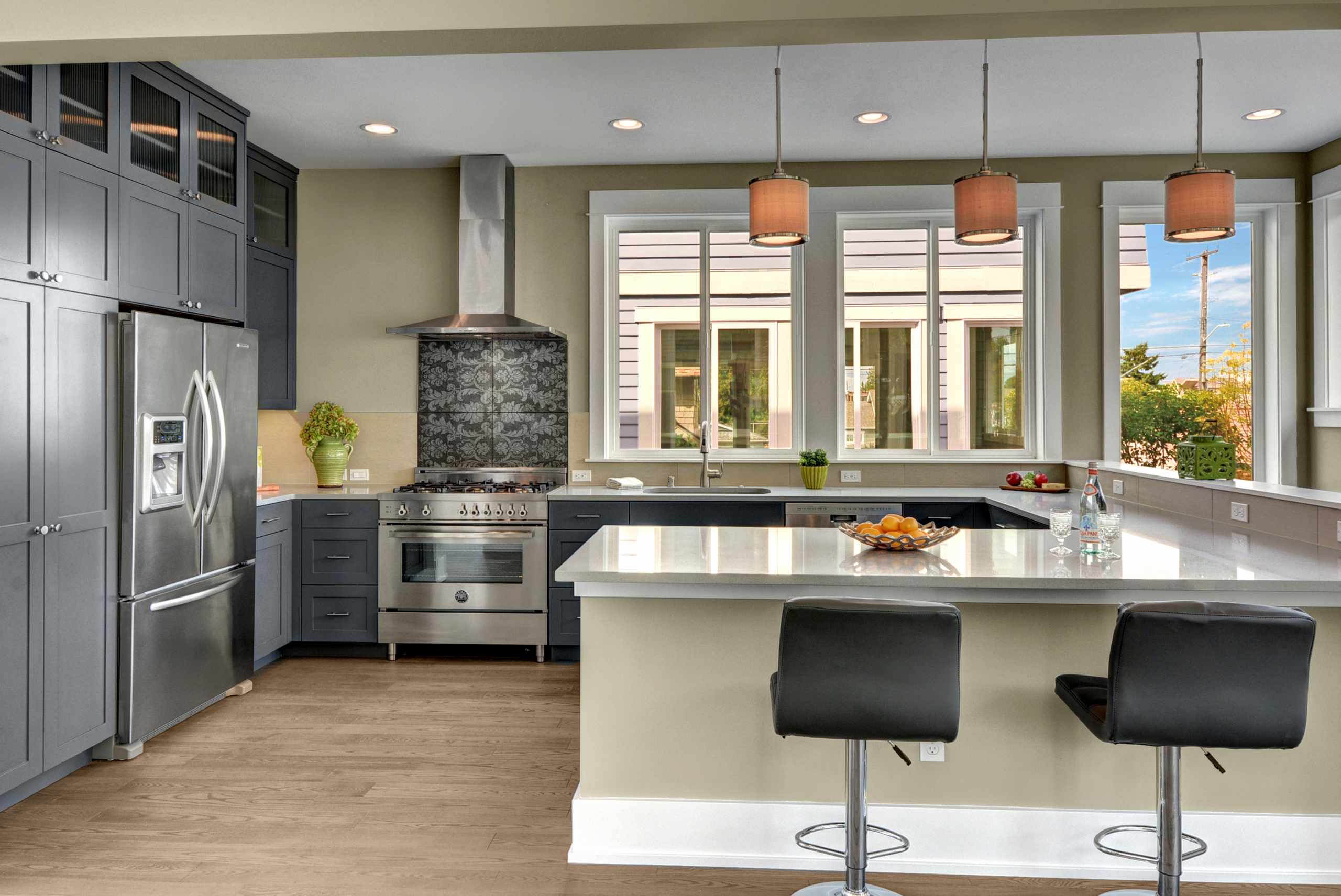 - Painted, shaker-style, custom cabinetry with glass accents by Abodian